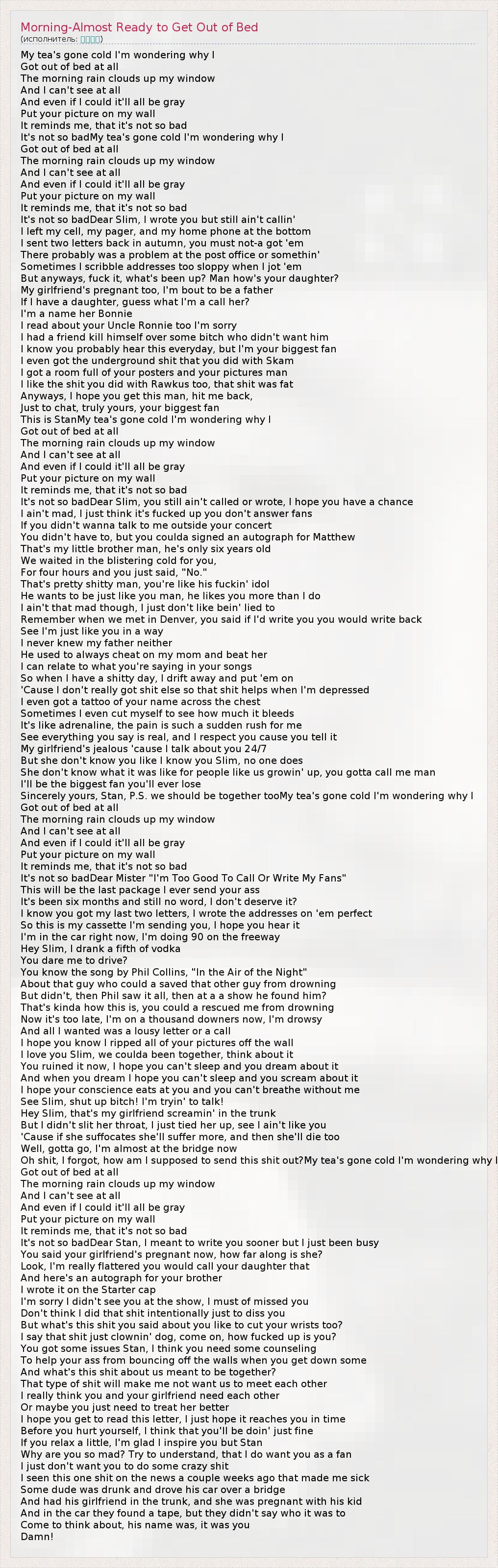 А как ты думаешь, о чем песня "Morning-Almost Ready to Get Out of Bed" ?