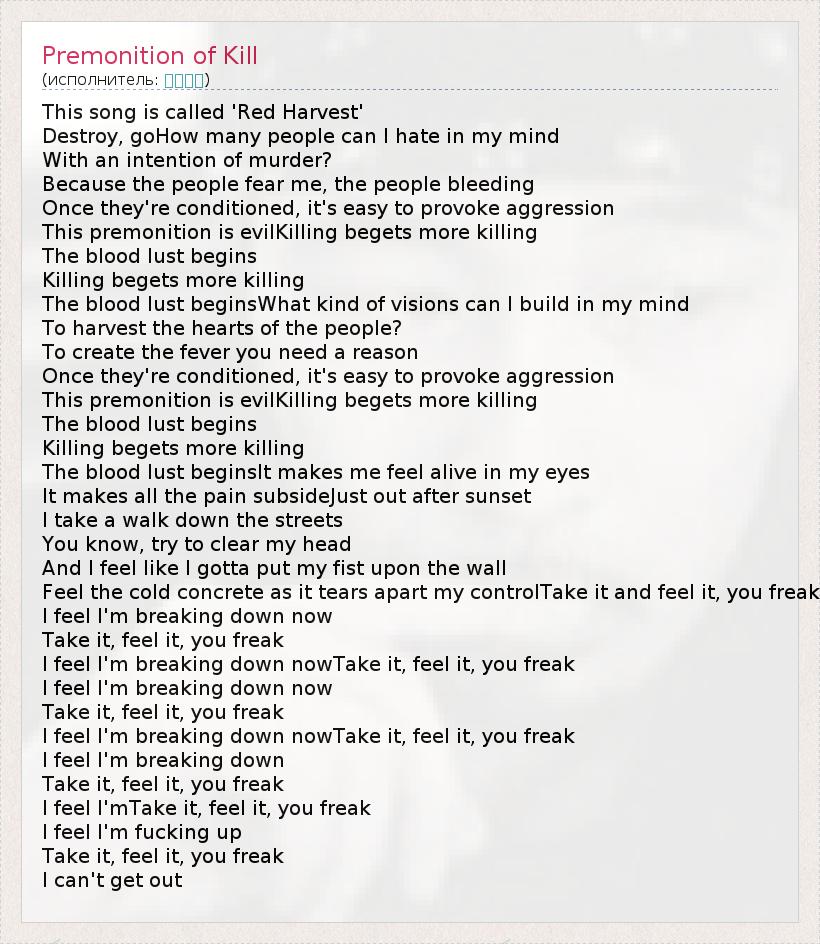 А как ты думаешь, о чем песня "Premonition of Kill" ?