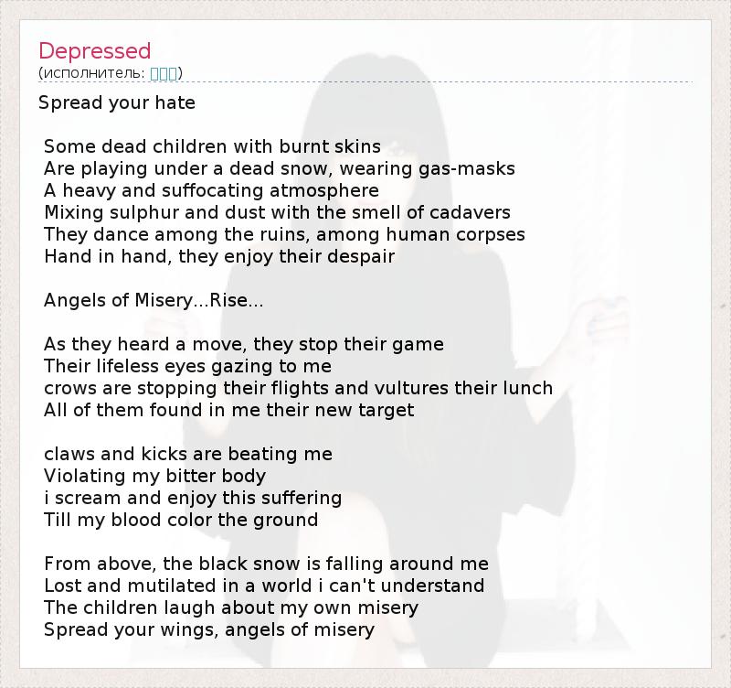 Spread your hate Some dead children with burnt skins Are playing under a dead snow, wearing gas-masks A heavy and suffocating atmosphere Mixing sulphur and dust with the smell of cadavers They dance among the ruins, among human corpses Hand in hand, they enjoy their despair Angels of Misery...Rise... As they heard a move, they stop their game Their lifeless eyes gazing to me crows are stopping their flights and vultures their lunch All of them found in me their new target claws and kicks are beating me Violating my bitter body i scream and enjoy this suffering Till my blood color the ground From above, the black snow is falling around me Lost and mutilated in a world i can't understand The children laugh about my own misery Spread your wings, angels of misery