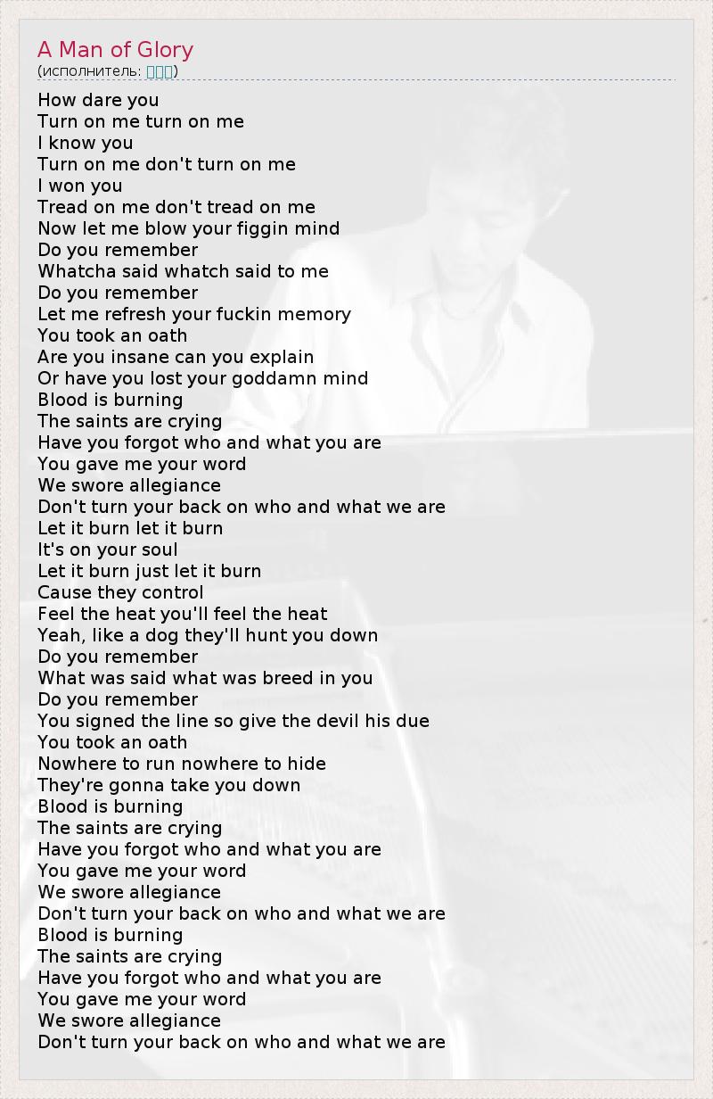 How dare you Turn on me turn on me I know you Turn on me don't turn on me I won you Tread on me don't tread on me Now let me blow your figgin mind Do you remember Whatcha said whatch said to me Do you remember Let me refresh your fuckin memory You took an oath Are you insane can you explain Or have you lost your goddamn mind Blood is burning The saints are crying Have you forgot who and what you are You gave me your word We swore allegiance Don't turn your back on who and what we are Let it burn let it burn It's on your soul Let it burn just let it burn Cause they control Feel the heat you'll feel the heat Yeah, like a dog they'll hunt you down Do you remember What was said what was breed in you Do you remember You signed the line so give the devil his due You took an oath Nowhere to run nowhere to hide They're gonna take you down Blood is burning The saints are crying Have you forgot who and what you are You gave me your word We swore allegiance Don't turn your back on who and what we are Blood is burning The saints are crying Have you forgot who and what you are You gave me your word We swore allegiance Don't turn your back on who and what we are