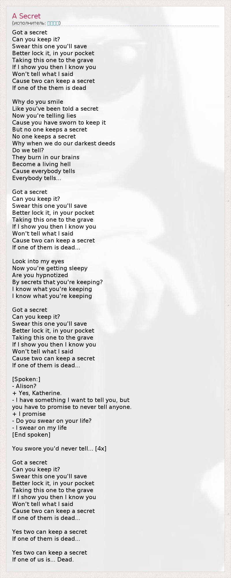 У меня есть тайна, Можешь ли ты сохранить ее? Клянись, что эту тайну ты сохранишь, Лучше спрячь ее у себя в кармане, Забери ее с собой в могилу. Если я открою её тебе, значит, я уверена, что ты Никому не расскажешь об услышанном, Потому что двое могут хранить тайну Только в том случае, если один из них мертв. Почему ты улыбаешься, Как будто с тобой поделились секретом? И теперь ты врешь, Потому что поклялась сохранить ее. Но никто не хранит тайны, Никто не хранит тайны. Почему когда мы совершаем самые плохие поступки, Мы рассказываем о них? Они прожигают нам мозг, Становятся сущим адом, Потому что все говорят, Все говорят ... У меня есть тайна, Можешь ли ты сохранить ее? Клянись, что эту тайну ты сохранишь, Лучше спрячь ее у себя в кармане, Забери ее с собой в могилу. Если я открою её тебе, значит, я уверена, что ты Никому не расскажешь об услышанном, Потому что двое могут хранить тайну Только в том случае, если один из них мертв. Посмотри в мои глаза - Ну вот - ты засыпаешь. Ты загипнотизирована Тайнами, которые пытаешься сохранить? Я знаю, что ты скрываешь, Я знаю, что ты скрываешь... У меня есть тайна, Можешь ли ты сохранить ее? Клянись, что эту тайну ты сохранишь, Лучше спрячь ее у себя в кармане, Забери ее с собой в могилу. Если я открою её тебе, значит, я уверена, что ты Никому не расскажешь об услышанном, Потому что двое могут хранить тайну Только в том случае, если один из них мертв. [Разговор:] - Элисон? + Да, Кэтрин. - У меня есть то, что я хочу тебе сказать, но Ты должна пообещать, что никому об этом не расскажешь. + Я обещаю. - Клянешься ли ты жизнью? + Клянусь жизнью. [Конец разговора] Ты поклялась, никогда никому не говорить... [4x] У меня есть тайна, Можешь ли ты сохранить ее? Клянись, что эту тайну ты сохранишь, Лучше спрячь ее у себя в кармане, Забери ее с собой в могилу. Если я открою её тебе, значит, я уверена, что ты Никому не расскажешь об услышанном, Потому что двое могут хранить тайну Только в том случае, если один из них мертв. Да, двое могут хранить тайну Только в том случае, если один из них мертв. Да, двое могут хранить тайну Только в том случае, если один из нас... Мертва.