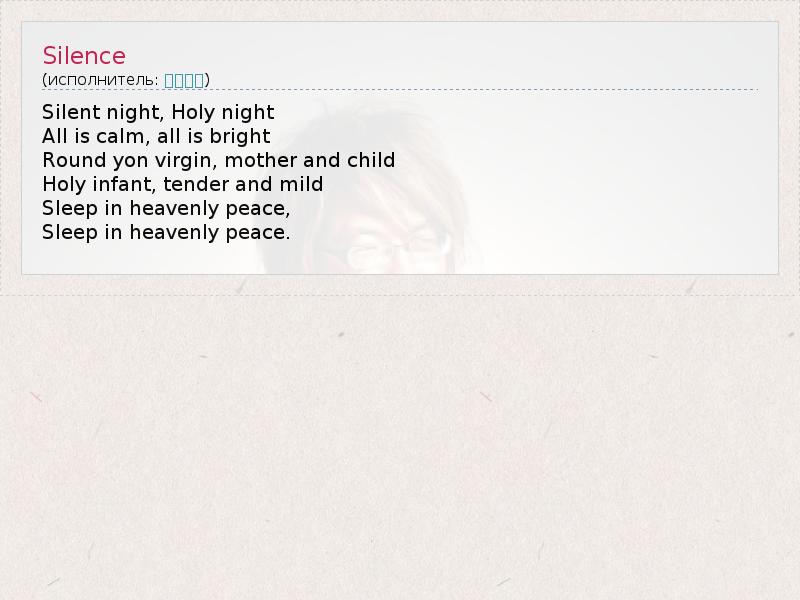 Silent night, Holy night All is calm, all is bright Round yon virgin, mother and child Holy infant, tender and mild Sleep in heavenly peace, Sleep in heavenly peace.