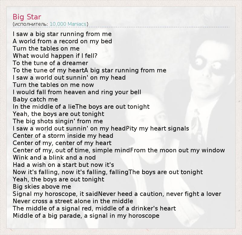 Это интересно:10,000 Мэниакс (10,000 Maniacs) - американская группа 1980-х годов. Впервые появилась в городе Джеймстаун (штат Нью-Йорк) в 1981 в составе: Натали Мерчент (вокал), Джером Огастиньяк (барабаны), Роберт Бак (гитара), Деннис Дрю (клавишные) и Стивен Густафсон (бас). Музыканты играли кавер-версии песен таких групп, как JOY DIVISION и GANG OF FOUR. В сентябре 1993 Натали Мерчент начала свою сольную карьеру.Дискография:HOPE... продолжение