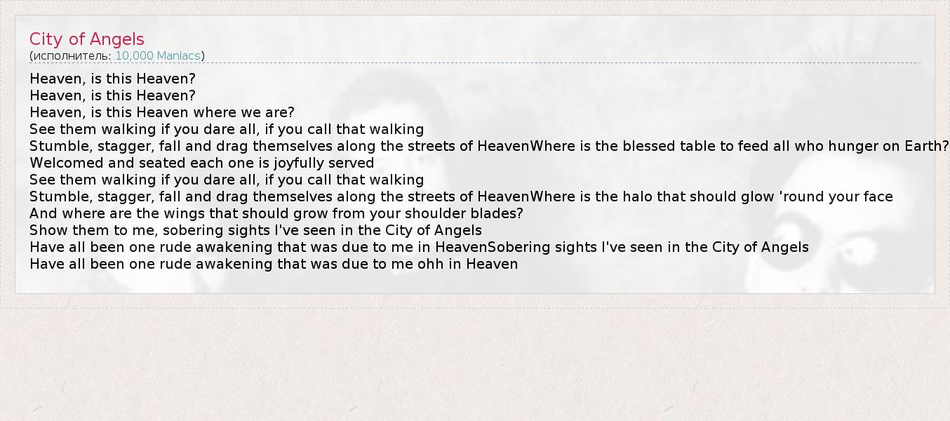 Это интересно:10,000 Мэниакс (10,000 Maniacs) - американская группа 1980-х годов. Впервые появилась в городе Джеймстаун (штат Нью-Йорк) в 1981 в составе: Натали Мерчент (вокал), Джером Огастиньяк (барабаны), Роберт Бак (гитара), Деннис Дрю (клавишные) и Стивен Густафсон (бас). Музыканты играли кавер-версии песен таких групп, как JOY DIVISION и GANG OF FOUR. В сентябре 1993 Натали Мерчент начала свою сольную карьеру.Дискография:HOPE... продолжение