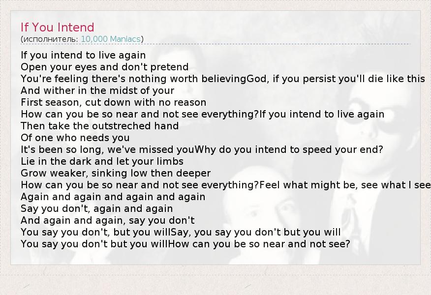 Это интересно:10,000 Мэниакс (10,000 Maniacs) - американская группа 1980-х годов. Впервые появилась в городе Джеймстаун (штат Нью-Йорк) в 1981 в составе: Натали Мерчент (вокал), Джером Огастиньяк (барабаны), Роберт Бак (гитара), Деннис Дрю (клавишные) и Стивен Густафсон (бас). Музыканты играли кавер-версии песен таких групп, как JOY DIVISION и GANG OF FOUR. В сентябре 1993 Натали Мерчент начала свою сольную карьеру.Дискография:HOPE... продолжение