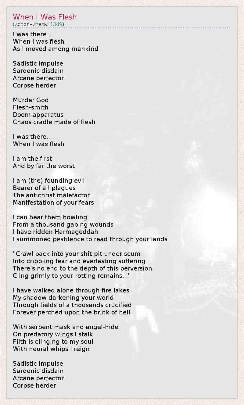 I was there... When I was flesh As I moved among mankind Sadistic impulse Sardonic disdain Arcane perfector Corpse herder Murder God Flesh-smith Doom apparatus Chaos cradle made of flesh I was there... When I was flesh I am the first And by far the worst I am (the) founding evil Bearer of all plagues The antichrist malefactor Manifestation of your fears I can hear them howling From a thousand gaping wounds I have ridden Harmageddah I summoned pestilence to read through your lands "Crawl back into your shit-pit under-scum Into crippling fear and everlasting suffering There's no end to the depth of this perversion Cling grimly to your rotting remains..." I have walked alone through fire lakes My shadow darkening your world Through fields of a thousands crucified Forever perched upon the brink of hell With serpent mask and angel-hide On predatory wings I stalk Filth is clinging to my soul With neural whips I reign Sadistic impulse Sardonic disdain Arcane perfector Corpse herder