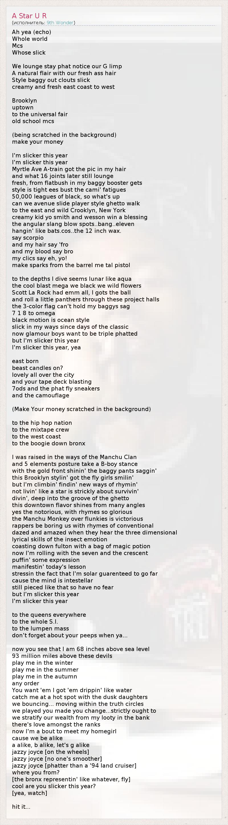 Это интересно:Patrick “9th Wonder” Douthit родился 25 января 1975 г. в городе Уинстон-Сейлем, что находится в штате Северная Королина. Один из самых уважаемых битмейкеров, не стесняющийся программы Fruity Loops, с которой он только недавно перешел на MPC 2500, по праву считается продолжителем дела Pete Rock и DJ Premier.— Вы должны знать историю того, частью чего вы хотите стать, — считает 9th Wonder, — Я учился у J Dilla и Madlib, которые учились... продолжение
