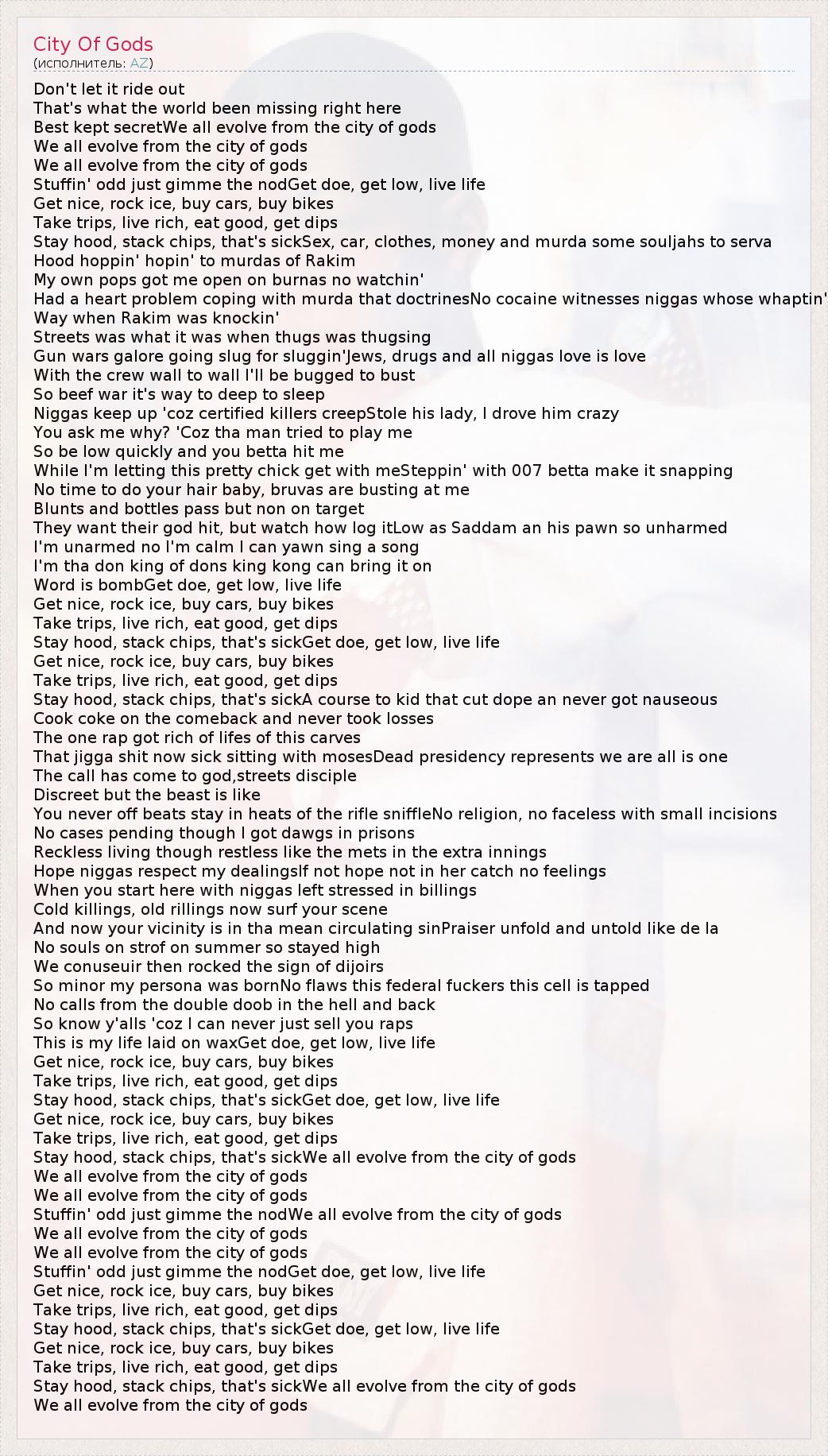 Это интересно:AZ (настоящее имя Энтони Круз, родился 9 марта 1973 года в Бруклине, Нью-Йорк) - рэппер с африканскими и доминиканскими корнями, номинант на Грэмми, представляет East Coast сцену. Изначально был известен как "AZ The Visualiza", достаточно популярный рэп исполнитель, но никогда не был в мейнстриме.Впервые AZ был замечен в 1994 году на альбоме Nasа "Illmatic", в композиции под названием "Lifes a Bitch".... продолжение