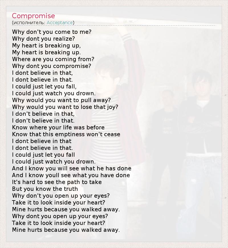 Это интересно:Acceptance - альтернативная рок-группа, образованная в Сиэтле в 1998 году. Их первый EP "Lost for Words" вышел в 2000 году, следующий - "Black Lines to Battlefields" - в 2003. Последняя пластинка "Phantoms" датирована 2005 годом.