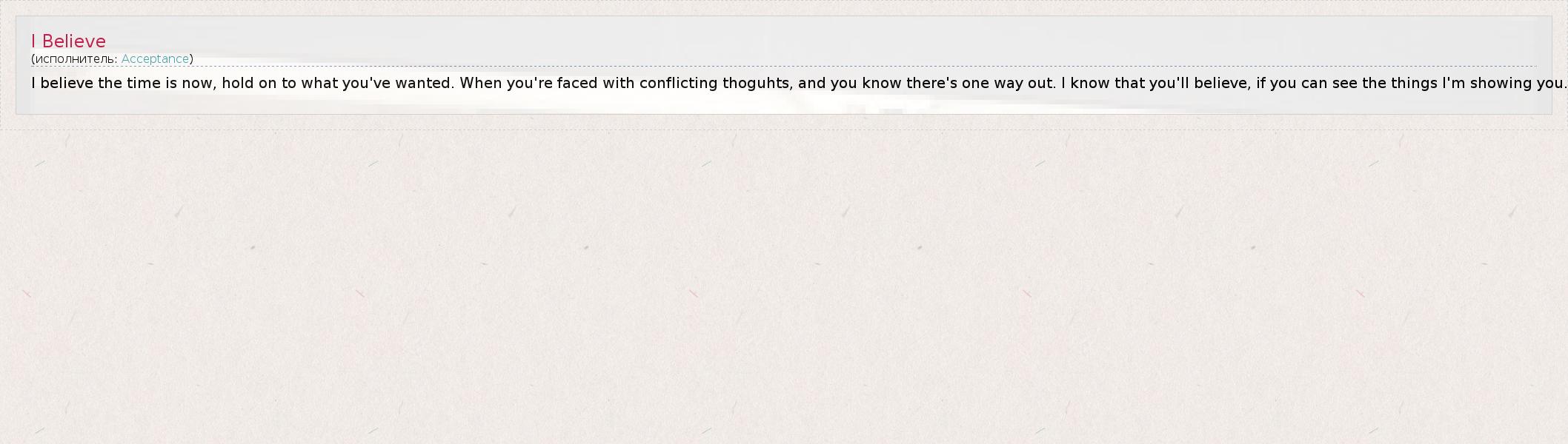 I believe the time is now, hold on to what you've wanted. When you're faced with conflicting thoguhts, and you know there's one way out. I know that you'll believe, if you can see the things I'm showing you.