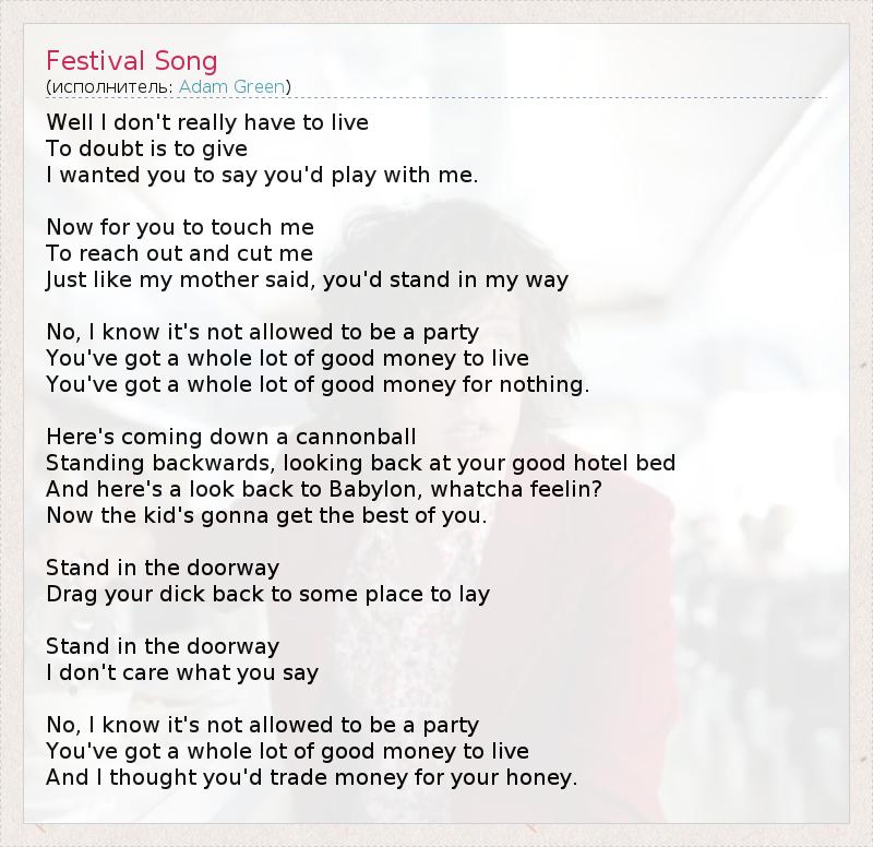 Это интересно:Adam Green. Основатель про-фолк группы The Moldy Peaches, ныне являющийся сольным артистом. Вскоре после её развала - один из идеологов ещё недавно новомодного (в начале 2000-ых) движения антифолк. Эдакой альтернативы всей этой около-экономической шумихе. Мягкого, без противодействия, противопоставления почти субкультуры реальности топ-менеджеров, кредитных линий, дорожных чеков, fast-food и fast-art (fast-movie,... продолжение