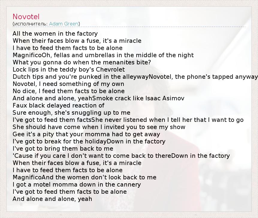 All the women in the factory When their faces blow a fuse, it's a miracle I have to feed them facts to be alone MagnificoOh, fellas and umbrellas in the middle of the night What you gonna do when the menanites bite? Lock lips in the teddy boy's Chevrolet Dutch tips and you're punked in the alleywayNovotel, the phone's tapped anyway Novotel, I need something of my own No dice, I feed them facts to be alone And alone and alone, yeahSmoke crack like Isaac Asimov Faux black delayed reaction of Sure enough, she's snuggling up to me I've got to feed them factsShe never listened when I tell her that I want to go She should have come when I invited you to see my show Gee it's a pity that your momma had to get away I've got to break for the holidayDown in the factory I've got to bring them back to me 'Cause if you care I don't want to come back to thereDown in the factory When their faces blow a fuse, it's a miracle I have to feed them facts to be alone MagnificoAnd the women don't look back to me I got a motel momma down in the cannery I've got to feed them facts to be alone And alone and alone, yeah