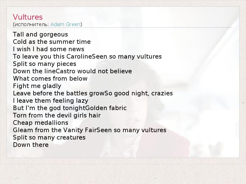 Это интересно:Adam Green. Основатель про-фолк группы The Moldy Peaches, ныне являющийся сольным артистом. Вскоре после её развала - один из идеологов ещё недавно новомодного (в начале 2000-ых) движения антифолк. Эдакой альтернативы всей этой около-экономической шумихе. Мягкого, без противодействия, противопоставления почти субкультуры реальности топ-менеджеров, кредитных линий, дорожных чеков, fast-food и fast-art (fast-movie,... продолжение