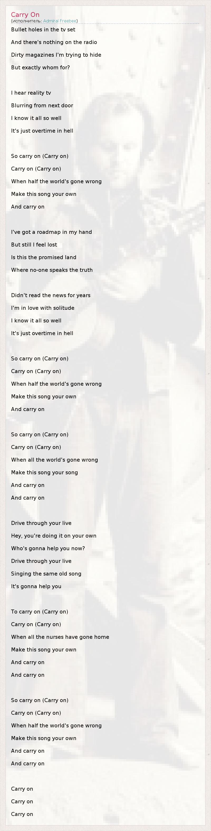 Bullet holes in the tv set And there's nothing on the radio Dirty magazines I'm trying to hide But exactly whom for? I hear reality tv Blurring from next door I know it all so well It's just overtime in hell So carry on (Carry on) Carry on (Carry on) When half the world's gone wrong Make this song your own And carry on I've got a roadmap in my hand But still I feel lost Is this the promised land Where no-one speaks the truth Didn't read the news for years I'm in love with solitude I know it all so well It's just overtime in hell So carry on (Carry on) Carry on (Carry on) When half the world's gone wrong Make this song your own And carry on So carry on (Carry on) Carry on (Carry on) When all the world's gone wrong Make this song your song And carry on And carry on Drive through your live Hey, you're doing it on your own Who's gonna help you now? Drive through your live Singing the same old song It's gonna help you To carry on (Carry on) Carry on (Carry on) When all the nurses have gone home Make this song your own And carry on And carry on So carry on (Carry on) Carry on (Carry on) When half the world's gone wrong Make this song your own And carry on And carry on Carry on Carry on Carry on