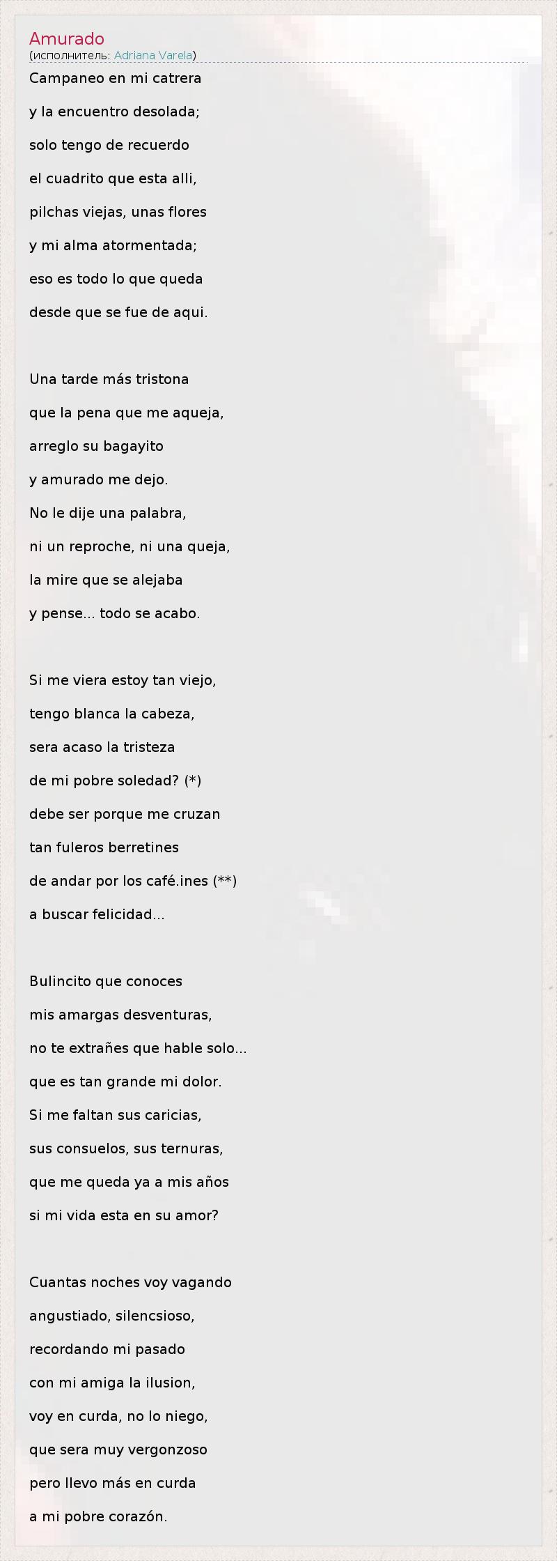 Campaneo en mi catrera y la encuentro desolada; solo tengo de recuerdo el cuadrito que esta alli, pilchas viejas, unas flores y mi alma atormentada; eso es todo lo que queda desde que se fue de aqui. Una tarde más tristona que la pena que me aqueja, arreglo su bagayito y amurado me dejo. No le dije una palabra, ni un reproche, ni una queja, la mire que se alejaba y pense... todo se acabo. Si me viera estoy tan viejo, tengo blanca la cabeza, sera acaso la tristeza de mi pobre soledad? (*) debe ser porque me cruzan tan fuleros berretines de andar por los café.ines (**) a buscar felicidad... Bulincito que conoces mis amargas desventuras, no te extrañes que hable solo... que es tan grande mi dolor. Si me faltan sus caricias, sus consuelos, sus ternuras, que me queda ya a mis años si mi vida esta en su amor? Cuantas noches voy vagando angustiado, silencsioso, recordando mi pasado con mi amiga la ilusion, voy en curda, no lo niego, que sera muy vergonzoso pero llevo más en curda a mi pobre corazón.