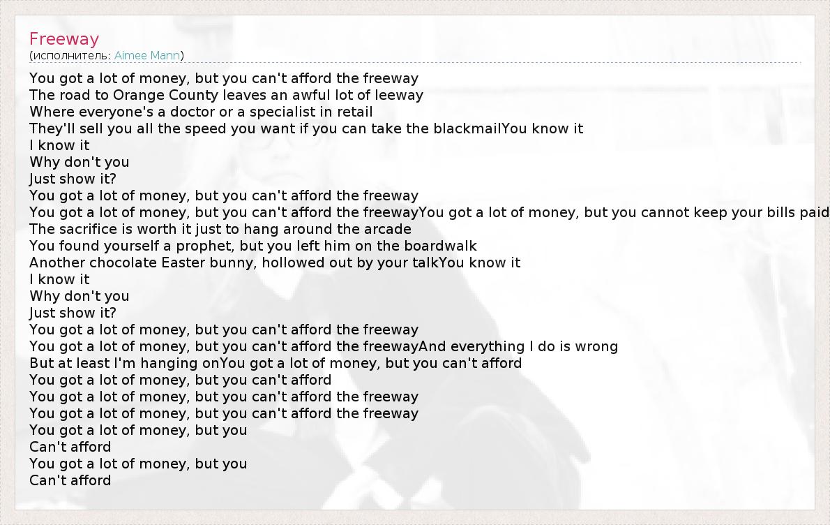 You got a lot of money, but you can't afford the freewayAnd everything I do is wrong