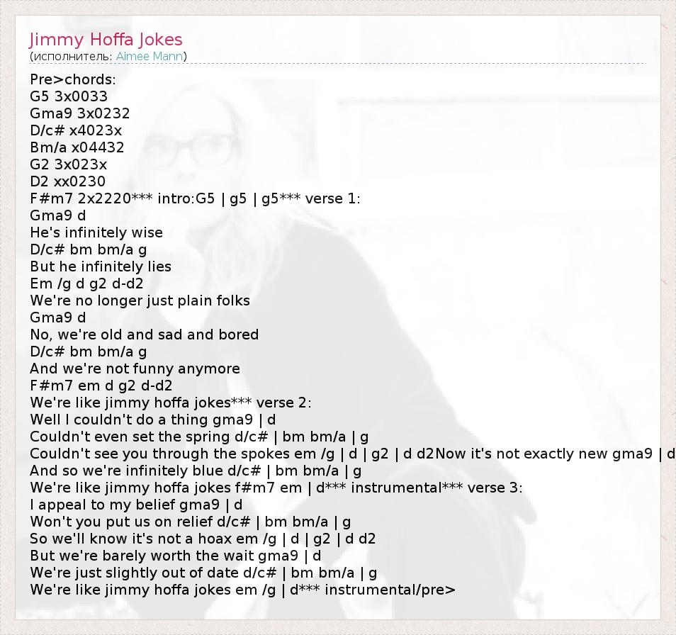 Pre>chords: G5 3x0033 Gma9 3x0232 D/c# x4023x Bm/a x04432 G2 3x023x D2 xx0230 F#m7 2x2220*** intro:G5 | g5 | g5*** verse 1: Gma9 d He's infinitely wise D/c# bm bm/a g But he infinitely lies Em /g d g2 d-d2 We're no longer just plain folks Gma9 d No, we're old and sad and bored D/c# bm bm/a g And we're not funny anymore F#m7 em d g2 d-d2 We're like jimmy hoffa jokes*** verse 2: Well I couldn't do a thing gma9 | d Couldn't even set the spring d/c# | bm bm/a | g Couldn't see you through the spokes em /g | d | g2 | d d2Now it's not exactly new gma9 | d And so we're infinitely blue d/c# | bm bm/a | g We're like jimmy hoffa jokes f#m7 em | d*** instrumental*** verse 3: I appeal to my belief gma9 | d Won't you put us on relief d/c# | bm bm/a | g So we'll know it's not a hoax em /g | d | g2 | d d2 But we're barely worth the wait gma9 | d We're just slightly out of date d/c# | bm bm/a | g We're like jimmy hoffa jokes em /g | d*** instrumental/pre>
