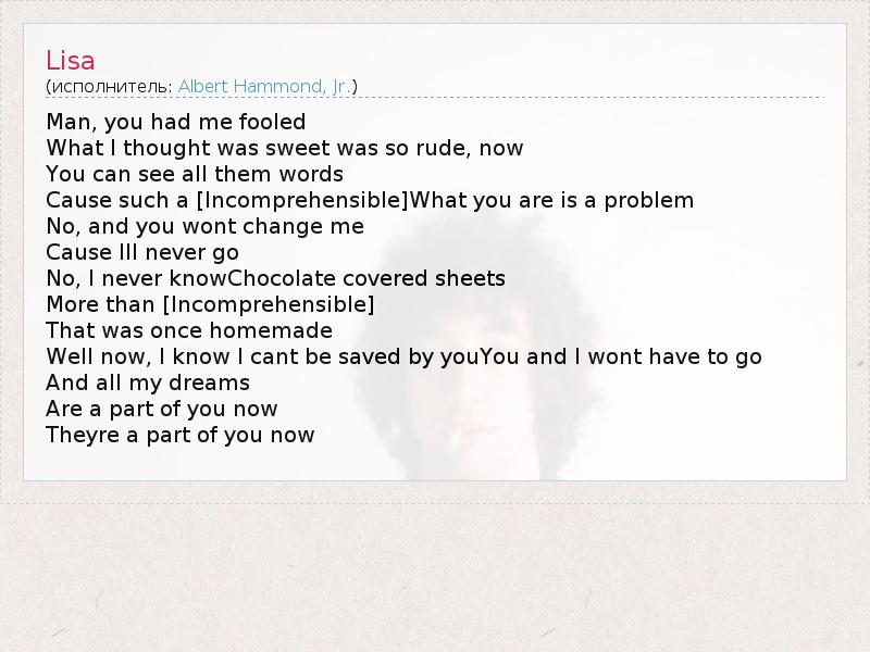 Это интересно:Альберт Хэммонд старший родился в Лондоне в далёком 1944 году - именно туда была эвакуирована его семья из Гибралтара в годы Второй Мировой. После войны, отец будущего гитариста The Strokes вновь вернулся на небольшой кусочек Британской земли близ Испании, начал заниматься музыкой, и лишь десять лет спустя уехал в США, где и познакомился с Клаудией Фернандес, аргентинкой с австрийско-перуанскими... продолжение