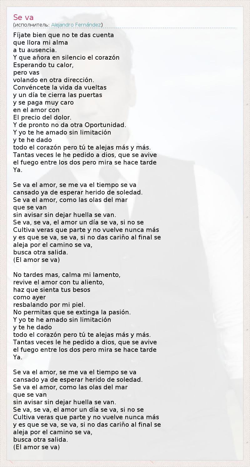 Это интересно:Алехандро сын знаменитого Висенте Фернандеса. Он с честью поддерживал семейные традиции и своим появлением на сцене прославил мексиканских ранчерасов среди молодого поколения. Бархатный голос певца и глубина его звучания, заставляли поклонников падать в обморок.Он родился в Мехико 24 апреля 1971 года, но как это ни странно был зарегистрирован в Гвадалахаре, в Ялиско - оно известно... продолжение