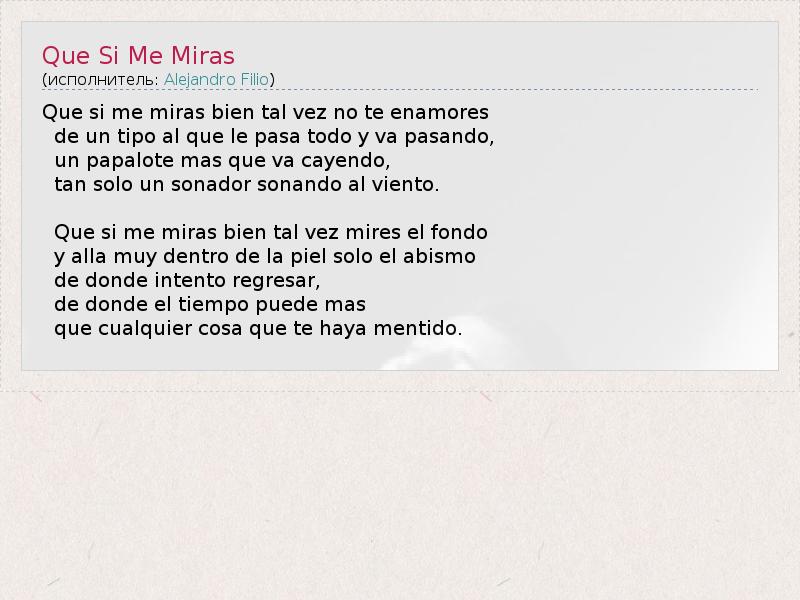 Que si me miras bien tal vez no te enamores de un tipo al que le pasa todo y va pasando, un papalote mas que va cayendo, tan solo un sonador sonando al viento. Que si me miras bien tal vez mires el fondo y alla muy dentro de la piel solo el abismo de donde intento regresar, de donde el tiempo puede mas que cualquier cosa que te haya mentido.