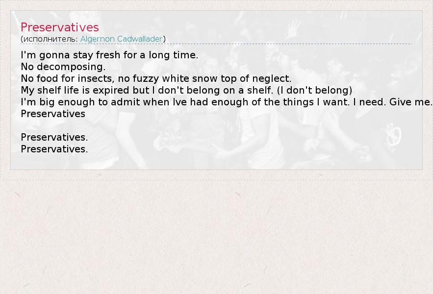 I'm gonna stay fresh for a long time. No decomposing. No food for insects, no fuzzy white snow top of neglect. My shelf life is expired but I don't belong on a shelf. (I don't belong) I'm big enough to admit when Ive had enough of the things I want. I need. Give me. Preservatives Preservatives. Preservatives.