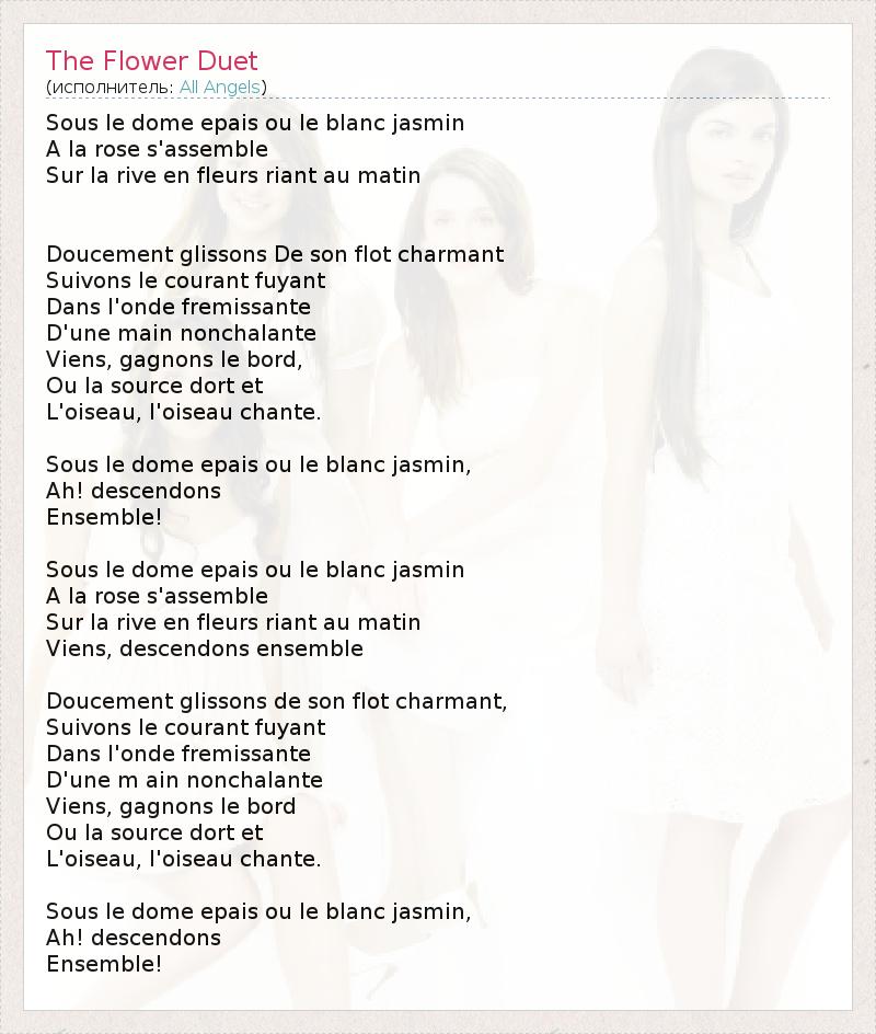 Цветочный дуэт Под пологом из белого жасмина, Переплетенного вместе с розами, На берегу реки, покрытого цветами, смеющихся утром Тихо плывут в чарующем потоке По течению реки В сверкающих волнах, Одной рукой стремятся достичь... Достичь берега, Где спит весна и Где птицы, птицы поют. Под пологом белого жасмина, Ах! Зовет нас! Вместе! Под пологом из белого жасмина, Переплетенного вместе с розами, На берегу реки, покрытого цветами, смеющихся утром, Давай спустимся туда вместе. Тихо плывут в чарующем потоке По течению реки В сверкающих волнах, Одной рукой стремятся достичь... Достичь берега, Где спит весна и Где птицы, птицы поют Под пологом из белого жасмина, Ах! Зовет нас! Вместе! (автор перевода Ariet)