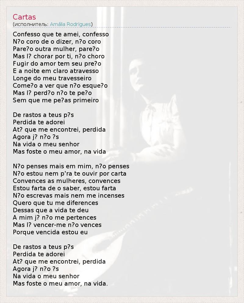Confesso que te amei, confesso N?o coro de o dizer, n?o coro Pare?o outra mulher, pare?o Mas l? chorar por ti, n?o choro Fugir do amor tem seu pre?o E a noite em claro atravesso Longe do meu travesseiro Come?o a ver que n?o esque?o Mas l? perd?o n?o te pe?o Sem que me pe?as primeiro De rastos a teus p?s Perdida te adorei At? que me encontrei, perdida Agora j? n?o ?s Na vida o meu senhor Mas foste o meu amor, na vida N?o penses mais em mim, n?o penses N?o estou nem p'ra te ouvir por carta Convences as mulheres, convences Estou farta de o saber, estou farta N?o escrevas mais nem me incenses Quero que tu me diferences Dessas que a vida te deu A mim j? n?o me pertences Mas l? vencer-me n?o vences Porque vencida estou eu De rastos a teus p?s Perdida te adorei At? que me encontrei, perdida Agora j? n?o ?s Na vida o meu senhor Mas foste o meu amor, na vida.