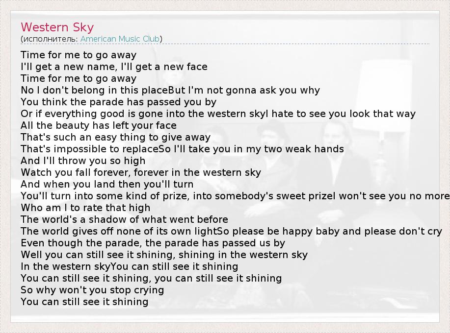 Это интересно:American Music Club (часто сокращают как AMC) – группа из Сан-Франциско, возглавляемая вокалистом и автором слов Марком Эйтцелем (Mark Eitzel). Группа записывалась и играла в клубах Сан-Франциско с середины 80-х, отличившись невероятным долголетием благодаря не финансовой успешности, а вниманию критиков.Несмотря на то, что группу часто причисляют к течениям слоукор/slowcore и сэдкор/sadcore и сравнивают... продолжение