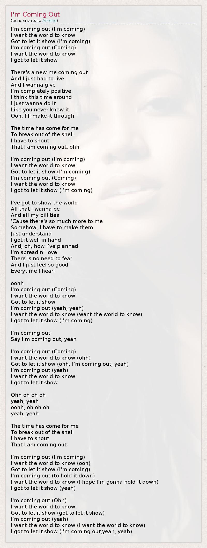 I'm coming out (I'm coming) I want the world to know Got to let it show (I'm coming) I'm coming out (Coming) I want the world to know I got to let it show There's a new me coming out And I just had to live And I wanna give I'm completely positive I think this time around I just wanna do it Like you never knew it Ooh, I'll make it through The time has come for me To break out of the shell I have to shout That I am coming out, ohh I'm coming out (I'm coming) I want the world to know Got to let it show (I'm coming) I'm coming out (Coming) I want the world to know I got to let it show (I'm coming) I've got to show the world All that I wanna be And all my billities 'Cause there's so much more to me Somehow, I have to make them Just understand I got it well in hand And, oh, how I've planned I'm spreadin' love There is no need to fear And I just feel so good Everytime I hear: oohh I'm coming out (Coming) I want the world to know Got to let it show I'm coming out (yeah, yeah) I want the world to know (want the world to know) I got to let it show (I'm coming) I'm coming out Say I'm coming out, yeah I'm coming out (Coming) I want the world to know (ohh) Got to let it show (ohh, I'm coming out, yeah) I'm coming out (yeah) I want the world to know I got to let it show Ohh oh oh oh yeah, yeah oohh, oh oh oh yeah, yeah The time has come for me To break out of the shell I have to shout That I am coming out I'm coming out (I'm coming) I want the world to know (ooh) Got to let it show (I'm coming) I'm coming out (to hold it down) I want the world to know (I hope I'm gonna hold it down) I got to let it show (yeah) I'm coming out (Ohh) I want the world to know Got to let it show (got to let it show) I'm coming out (yeah) I want the world to know (I want the world to know) I got to let it show (I'm coming out,yeah, yeah)