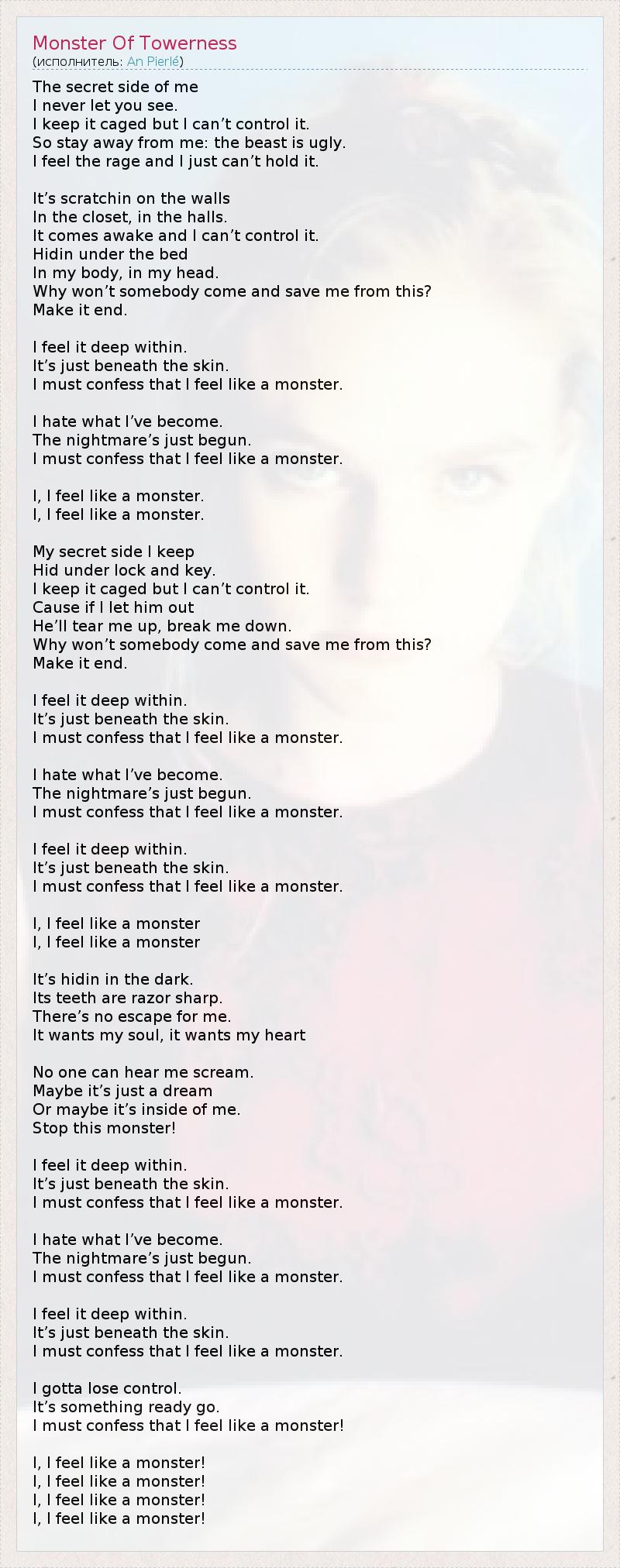 Я никогда не покажу тебе Свою тайную сторону. Я держу её в клетке, но не могу контролировать. Поэтому держись от меня подальше: чудовище уродливо. Я чувствую ярость и просто не могу её сдерживать. Оно оставляет царапины на стенах, В кладовой, в коридоре. Оно просыпается, и я не могу его контролировать. Прячется под кроватью, В моём теле, в моей голове. Почему кто-нибудь не придёт и не спасёт меня от этого? Пусть это закончится! Я чувствую это глубоко внутри, Это уже под кожей. Я должен признаться, что ощущаю себя монстром. Я ненавижу то, чем я стал. Кошмар только начался. Я должен признаться, что ощущаю себя монстром. Я, я ощущаю себя монстром! Я, я ощущаю себя монстром! Свою тайную сторону я храню За семью замками. Я держу её в клетке, но не могу контролировать, Потому что если я выпущу его, Монстр разорвёт меня на части, погубит меня. Почему кто-нибудь не придёт и не спасёт меня от этого? Пусть это закончится! Я чувствую это глубоко внутри, Это уже под кожей. Я должен признаться, что ощущаю себя монстром. Я ненавижу то, чем я стал. Кошмар только начался. Я должен признаться, что я ощущаю себя монстром. Я чувствую это глубоко внутри, Это уже под кожей. Я должен признаться, что ощущаю себя монстром. Я, я ощущаю себя монстром. Я, я ощущаю себя монстром. Он прячется в темноте, Его зубы, как лезвия бритвы. Нет спасения для меня, Он хочет мою душу, он хочет моё сердце. Никто не услышит мой крик, Может, это просто сон, Или, может, это внутри меня. Останови этого монстра! Я чувствую это глубоко внутри, Это уже под кожей. Я должен признаться, что ощущаю себя монстром. Я ненавижу то, чем я стал. Кошмар только начался. Я должен признаться, что я ощущаю себя монстром. Я чувствую это глубоко внутри, Это уже под кожей. Я должен признаться, что ощущаю себя монстром. Я потеряю контроль, И этот процесс уже начался.... Я должен признаться, что ощущаю себя монстром! Я, я ощущаю себя монстром! Я, я ощущаю себя монстром! Я, я ощущаю себя монстром! Я, я ощущаю себя монстром!