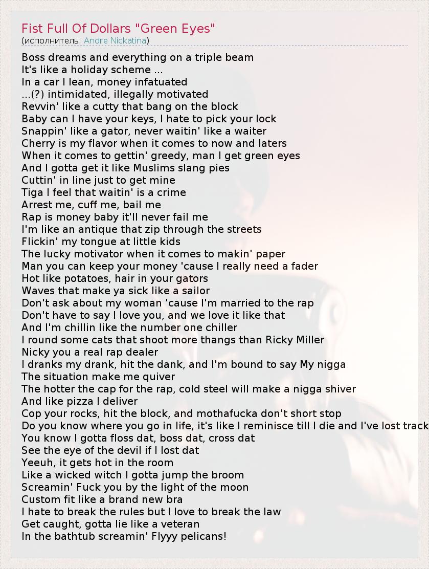 ГлавнаяИсполнителиAndre NickatinaFist Full Of Dollars "Green Eyes"