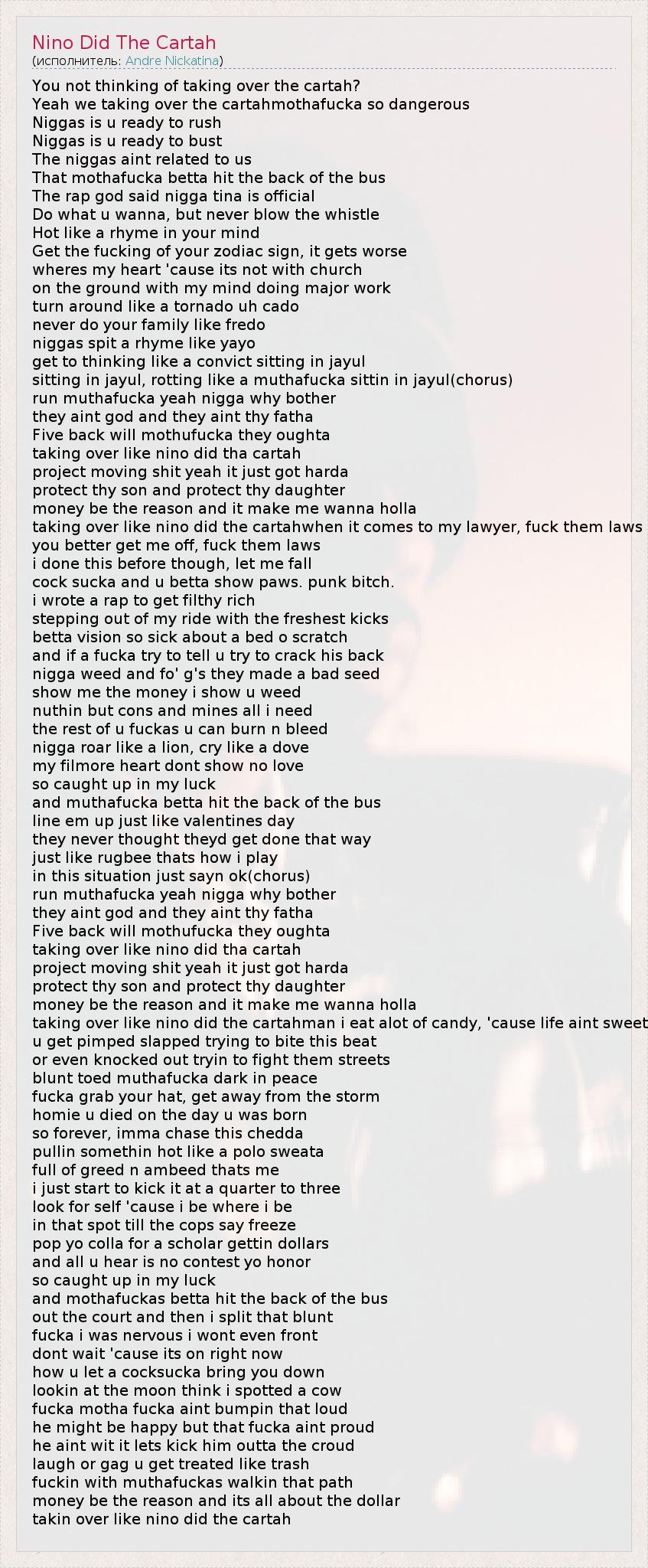 А как ты думаешь, о чем песня "Nino Did The Cartah" ?