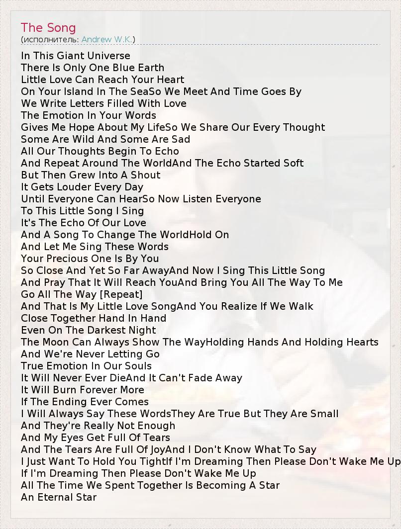 In This Giant Universe There Is Only One Blue Earth Little Love Can Reach Your Heart On Your Island In The SeaSo We Meet And Time Goes By We Write Letters Filled With Love The Emotion In Your Words Gives Me Hope About My LifeSo We Share Our Every Thought Some Are Wild And Some Are Sad All Our Thoughts Begin To Echo And Repeat Around The WorldAnd The Echo Started Soft But Then Grew Into A Shout It Gets Louder Every Day Until Everyone Can HearSo Now Listen Everyone To This Little Song I Sing It's The Echo Of Our Love And A Song To Change The WorldHold On And Let Me Sing These Words Your Precious One Is By You So Close And Yet So Far AwayAnd Now I Sing This Little Song And Pray That It Will Reach YouAnd Bring You All The Way To Me Go All The Way [Repeat] And That Is My Little Love SongAnd You Realize If We Walk Close Together Hand In Hand Even On The Darkest Night The Moon Can Always Show The WayHolding Hands And Holding Hearts And We're Never Letting Go True Emotion In Our Souls It Will Never Ever DieAnd It Can't Fade Away It Will Burn Forever More If The Ending Ever Comes I Will Always Say These WordsThey Are True But They Are Small And They're Really Not Enough And My Eyes Get Full Of Tears And The Tears Are Full Of JoyAnd I Don't Know What To Say I Just Want To Hold You TightIf I'm Dreaming Then Please Don't Wake Me Up If I'm Dreaming Then Please Don't Wake Me Up All The Time We Spent Together Is Becoming A Star An Eternal Star