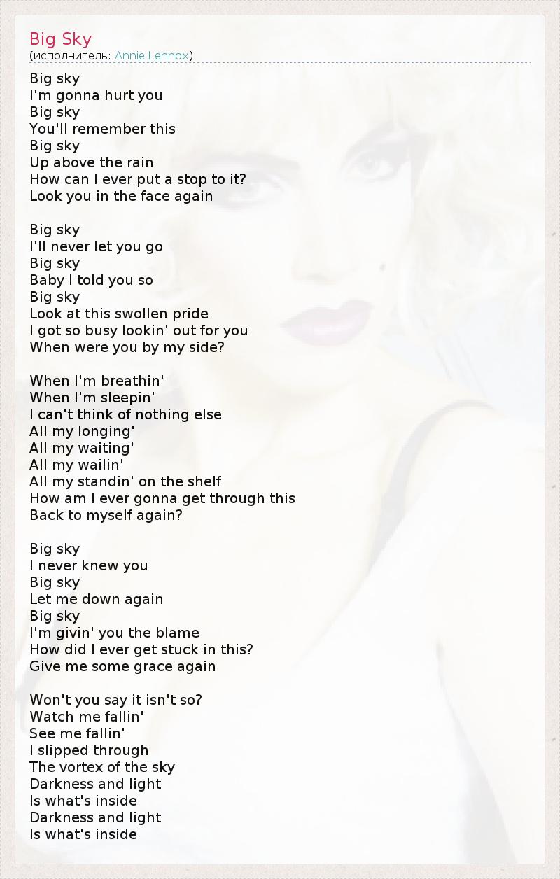 Это интересно:Энни Леннокс (англ. Annie Lennox; род. 25 декабря 1954, Абердин, Шотландия, Соединённое Королевство) — шотландская певица, композитор и автор песен, одна из самых известных женщин в рок-музыке в конце XX — начале XXI веков. В 1979 — 1990 и 1999 — 2005 годах являлась вокалисткой синти-поп группы “Eurythmics”.Она начала сольную карьеру в начале 1990-х годов выпустив в 1992 году альбом “Diva”,... продолжение