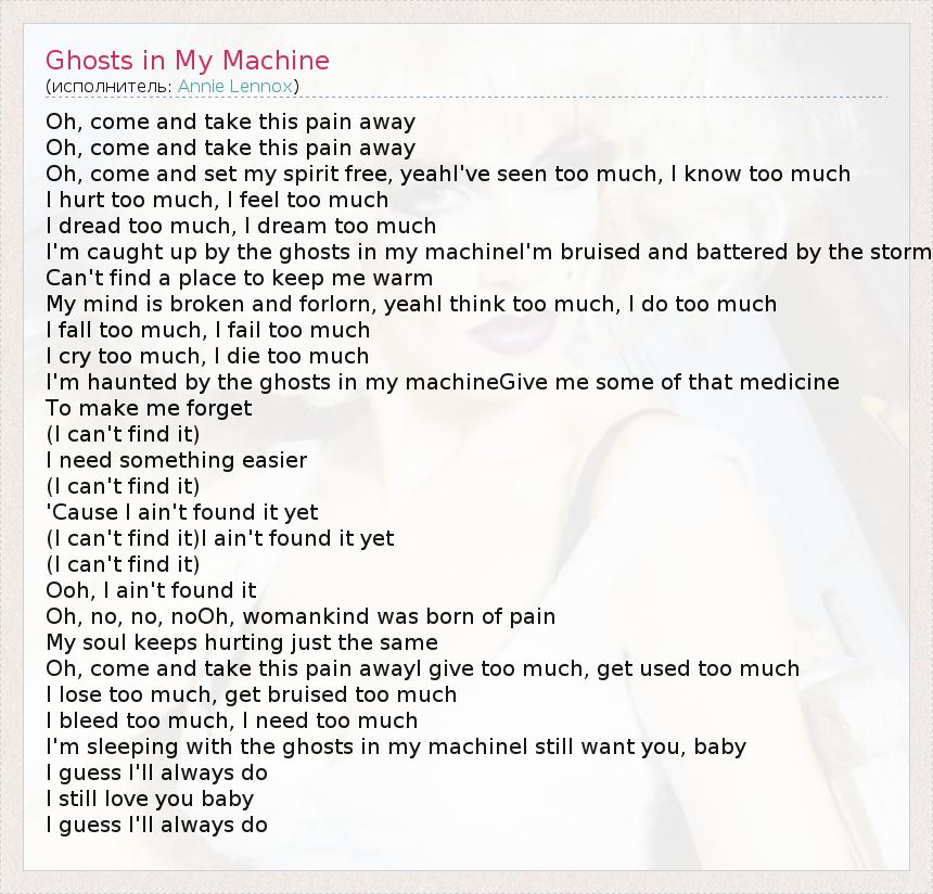 Oh, come and take this pain away Oh, come and take this pain away Oh, come and set my spirit free, yeahI've seen too much, I know too much I hurt too much, I feel too much I dread too much, I dream too much I'm caught up by the ghosts in my machineI'm bruised and battered by the storm Can't find a place to keep me warm My mind is broken and forlorn, yeahI think too much, I do too much I fall too much, I fail too much I cry too much, I die too much I'm haunted by the ghosts in my machineGive me some of that medicine To make me forget (I can't find it) I need something easier (I can't find it) 'Cause I ain't found it yet (I can't find it)I ain't found it yet (I can't find it) Ooh, I ain't found it Oh, no, no, noOh, womankind was born of pain My soul keeps hurting just the same Oh, come and take this pain awayI give too much, get used too much I lose too much, get bruised too much I bleed too much, I need too much I'm sleeping with the ghosts in my machineI still want you, baby I guess I'll always do I still love you baby I guess I'll always do