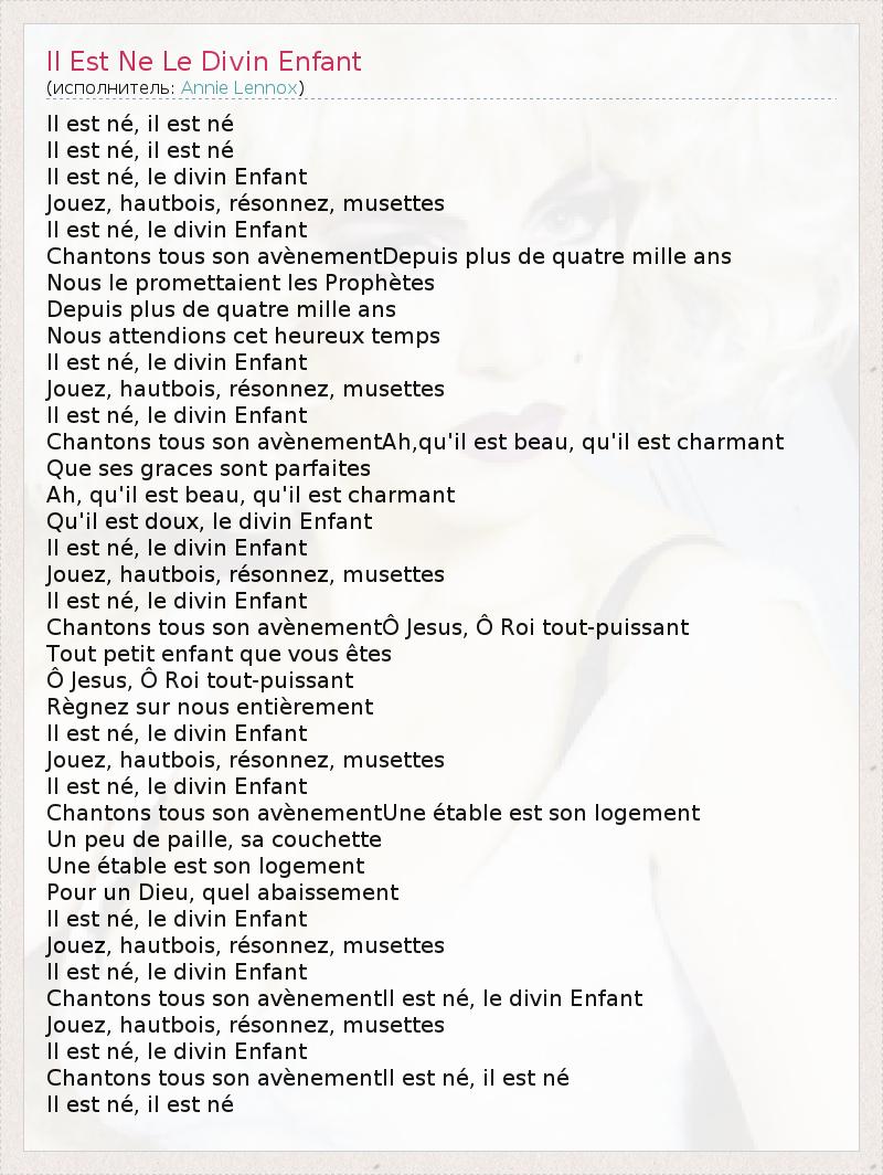 Il est né, il est né Il est né, il est né Il est né, le divin Enfant Jouez, hautbois, résonnez, musettes Il est né, le divin Enfant Chantons tous son avènementDepuis plus de quatre mille ans Nous le promettaient les Prophètes Depuis plus de quatre mille ans Nous attendions cet heureux temps Il est né, le divin Enfant Jouez, hautbois, résonnez, musettes Il est né, le divin Enfant Chantons tous son avènementAh,qu'il est beau, qu'il est charmant Que ses graces sont parfaites Ah, qu'il est beau, qu'il est charmant Qu'il est doux, le divin Enfant Il est né, le divin Enfant Jouez, hautbois, résonnez, musettes Il est né, le divin Enfant Chantons tous son avènementÔ Jesus, Ô Roi tout-puissant Tout petit enfant que vous êtes Ô Jesus, Ô Roi tout-puissant Règnez sur nous entièrement Il est né, le divin Enfant Jouez, hautbois, résonnez, musettes Il est né, le divin Enfant Chantons tous son avènementUne étable est son logement Un peu de paille, sa couchette Une étable est son logement Pour un Dieu, quel abaissement Il est né, le divin Enfant Jouez, hautbois, résonnez, musettes Il est né, le divin Enfant Chantons tous son avènementIl est né, le divin Enfant Jouez, hautbois, résonnez, musettes Il est né, le divin Enfant Chantons tous son avènementIl est né, il est né Il est né, il est né