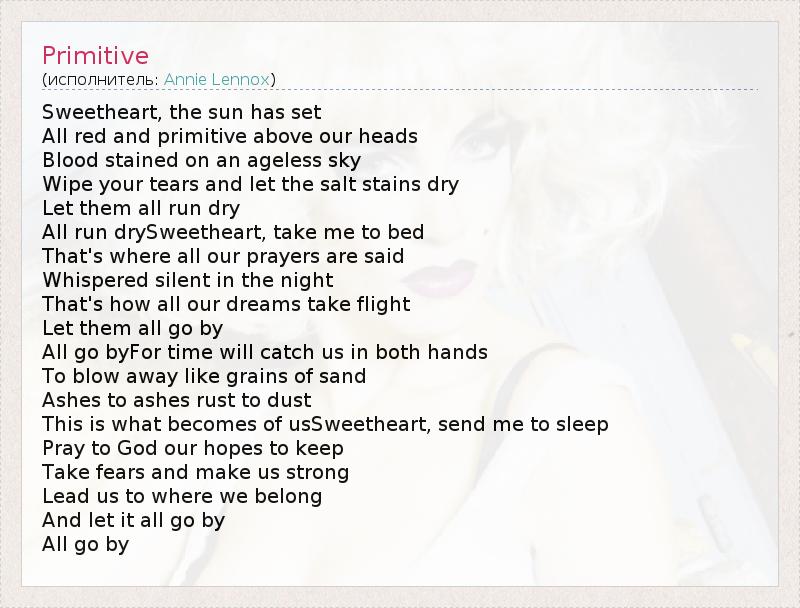 Sweetheart, the sun has set All red and primitive above our heads Blood stained on an ageless sky Wipe your tears and let the salt stains dry Let them all run dry All run drySweetheart, take me to bed That's where all our prayers are said Whispered silent in the night That's how all our dreams take flight Let them all go by All go byFor time will catch us in both hands To blow away like grains of sand Ashes to ashes rust to dust This is what becomes of usSweetheart, send me to sleep Pray to God our hopes to keep Take fears and make us strong Lead us to where we belong And let it all go by All go by