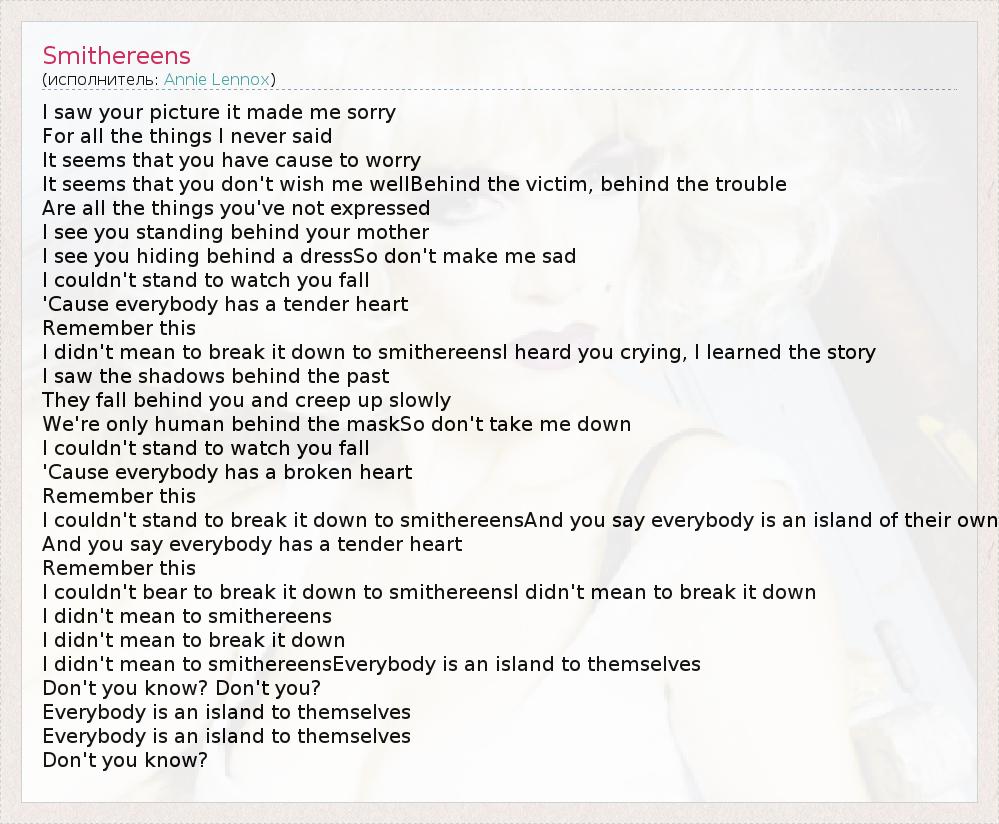 I didn't mean to break it down to smithereensI heard you crying, I learned the story