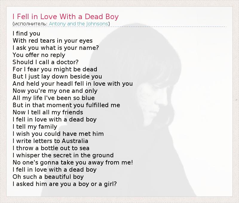 I find you With red tears in your eyes I ask you what is your name? You offer no reply Should I call a doctor? For I fear you might be dead But I just lay down beside you And held your headI fell in love with you Now you're my one and only All my life I've been so blue But in that moment you fulfilled me Now I tell all my friends I fell in love with a dead boy I tell my family I wish you could have met him I write letters to Australia I throw a bottle out to sea I whisper the secret in the ground No one's gonna take you away from me! I fell in love with a dead boy Oh such a beautiful boy I asked him are you a boy or a girl?