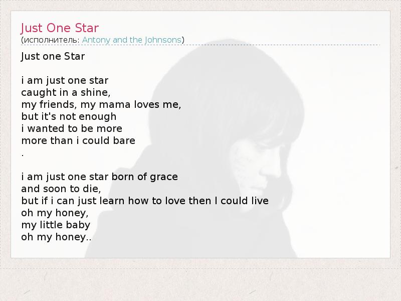 Just one Star i am just one star caught in a shine, my friends, my mama loves me, but it's not enough i wanted to be more more than i could bare . i am just one star born of grace and soon to die, but if i can just learn how to love then I could live oh my honey, my little baby oh my honey..
