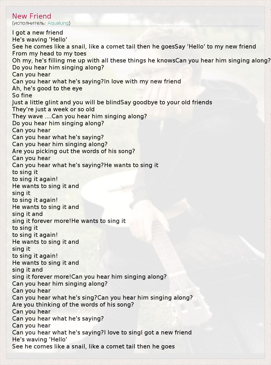 I got a new friend He's waving 'Hello' See he comes like a snail, like a comet tail then he goesSay 'Hello' to my new friend From my head to my toes Oh my, he's filling me up with all these things he knowsCan you hear him singing along? Do you hear him singing along? Can you hear Can you hear what he's saying?In love with my new friend Ah, he's good to the eye So fine Just a little glint and you will be blindSay goodbye to your old friends They're just a week or so old They wave ....Can you hear him singing along? Do you hear him singing along? Can you hear Can you hear what he's saying? Can you hear him singing along? Are you picking out the words of his song? Can you hear Can you hear what he's saying?He wants to sing it to sing it to sing it again! He wants to sing it and sing it to sing it again! He wants to sing it and sing it and sing it forever more!He wants to sing it to sing it to sing it again! He wants to sing it and sing it to sing it again! He wants to sing it and sing it and sing it forever more!Can you hear him singing along? Can you hear him singing along? Can you hear Can you hear what he's sing?Can you hear him singing along? Are you thinking of the words of his song? Can you hear Can you hear what he's saying? Can you hear Can you hear what he's saying?I love to singI got a new friend He's waving 'Hello' See he comes like a snail, like a comet tail then he goes