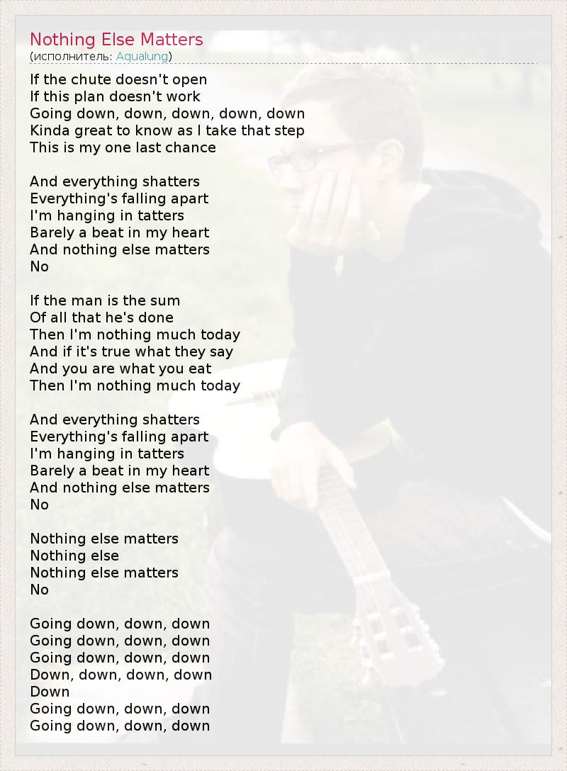 If the chute doesn't open If this plan doesn't work Going down, down, down, down, down Kinda great to know as I take that step This is my one last chance And everything shatters Everything's falling apart I'm hanging in tatters Barely a beat in my heart And nothing else matters No If the man is the sum Of all that he's done Then I'm nothing much today And if it's true what they say And you are what you eat Then I'm nothing much today And everything shatters Everything's falling apart I'm hanging in tatters Barely a beat in my heart And nothing else matters No Nothing else matters Nothing else Nothing else matters No Going down, down, down Going down, down, down Going down, down, down Down, down, down, down Down Going down, down, down Going down, down, down
