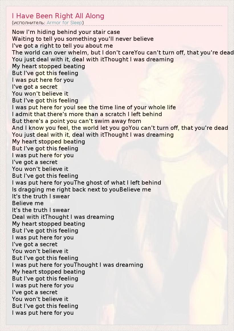 А как ты думаешь, о чем песня "I Have Been Right All Along" ?