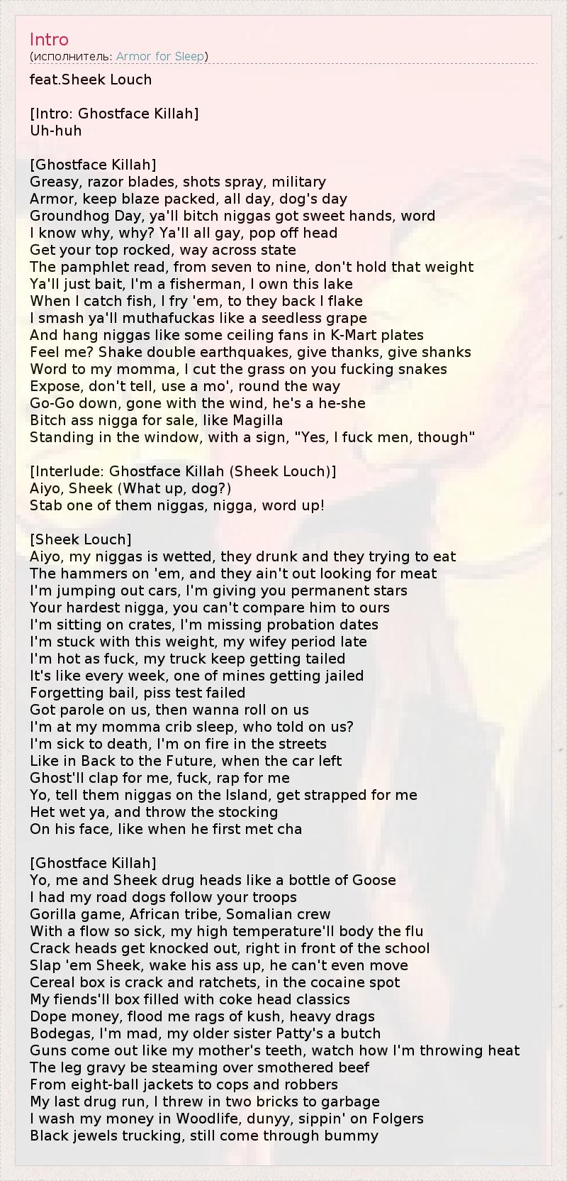 feat.Sheek Louch [Intro: Ghostface Killah] Uh-huh [Ghostface Killah] Greasy, razor blades, shots spray, military Armor, keep blaze packed, all day, dog's day Groundhog Day, ya'll bitch niggas got sweet hands, word I know why, why? Ya'll all gay, pop off head Get your top rocked, way across state The pamphlet read, from seven to nine, don't hold that weight Ya'll just bait, I'm a fisherman, I own this lake When I catch fish, I fry 'em, to they back I flake I smash ya'll muthafuckas like a seedless grape And hang niggas like some ceiling fans in K-Mart plates Feel me? Shake double earthquakes, give thanks, give shanks Word to my momma, I cut the grass on you fucking snakes Expose, don't tell, use a mo', round the way Go-Go down, gone with the wind, he's a he-she Bitch ass nigga for sale, like Magilla Standing in the window, with a sign, "Yes, I fuck men, though" [Interlude: Ghostface Killah (Sheek Louch)] Aiyo, Sheek (What up, dog?) Stab one of them niggas, nigga, word up! [Sheek Louch] Aiyo, my niggas is wetted, they drunk and they trying to eat The hammers on 'em, and they ain't out looking for meat I'm jumping out cars, I'm giving you permanent stars Your hardest nigga, you can't compare him to ours I'm sitting on crates, I'm missing probation dates I'm stuck with this weight, my wifey period late I'm hot as fuck, my truck keep getting tailed It's like every week, one of mines getting jailed Forgetting bail, piss test failed Got parole on us, then wanna roll on us I'm at my momma crib sleep, who told on us? I'm sick to death, I'm on fire in the streets Like in Back to the Future, when the car left Ghost'll clap for me, fuck, rap for me Yo, tell them niggas on the Island, get strapped for me Het wet ya, and throw the stocking On his face, like when he first met cha [Ghostface Killah] Yo, me and Sheek drug heads like a bottle of Goose I had my road dogs follow your troops Gorilla game, African tribe, Somalian crew With a flow so sick, my high temperature'll body the flu Crack heads get knocked out, right in front of the school Slap 'em Sheek, wake his ass up, he can't even move Cereal box is crack and ratchets, in the cocaine spot My fiends'll box filled with coke head classics Dope money, flood me rags of kush, heavy drags Bodegas, I'm mad, my older sister Patty's a butch Guns come out like my mother's teeth, watch how I'm throwing heat The leg gravy be steaming over smothered beef From eight-ball jackets to cops and robbers My last drug run, I threw in two bricks to garbage I wash my money in Woodlife, dunyy, sippin' on Folgers Black jewels trucking, still come through bummy
