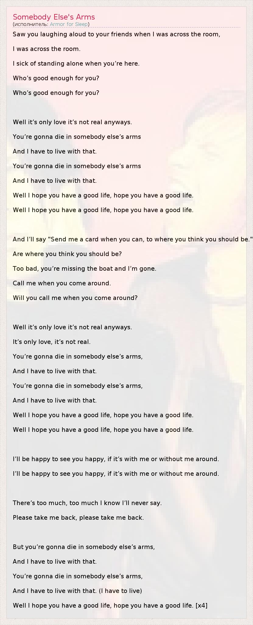 А как ты думаешь, о чем песня "Somebody Else's Arms" ?