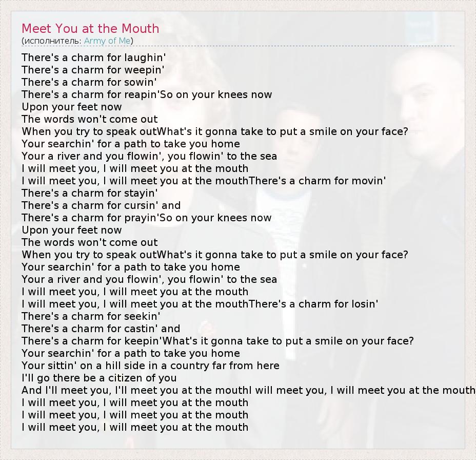 And I'll meet you, I'll meet you at the mouthI will meet you, I will meet you at the mouth
