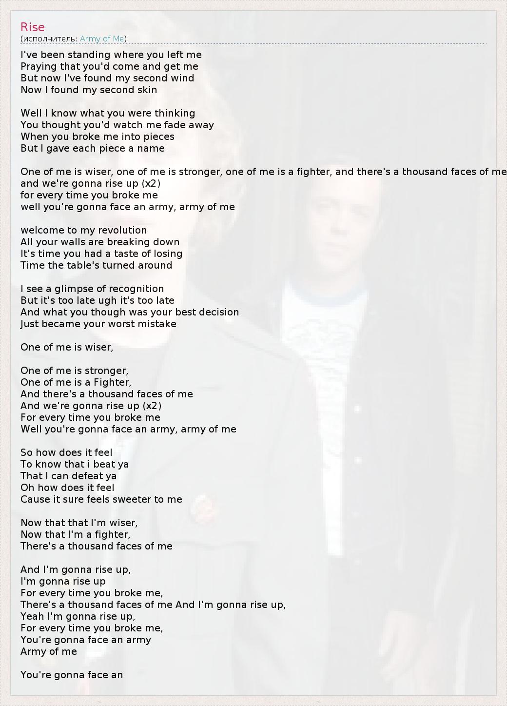 I've been standing where you left me Praying that you'd come and get me But now I've found my second wind Now I found my second skin Well I know what you were thinking You thought you'd watch me fade away When you broke me into pieces But I gave each piece a name One of me is wiser, one of me is stronger, one of me is a fighter, and there's a thousand faces of me and we're gonna rise up (x2) for every time you broke me well you're gonna face an army, army of me welcome to my revolution All your walls are breaking down It's time you had a taste of losing Time the table's turned around I see a glimpse of recognition But it's too late ugh it's too late And what you though was your best decision Just became your worst mistake One of me is wiser, One of me is stronger, One of me is a Fighter, And there's a thousand faces of me And we're gonna rise up (x2) For every time you broke me Well you're gonna face an army, army of me So how does it feel To know that i beat ya That I can defeat ya Oh how does it feel Cause it sure feels sweeter to me Now that that I'm wiser, Now that I'm a fighter, There's a thousand faces of me And I'm gonna rise up, I'm gonna rise up For every time you broke me, There's a thousand faces of me And I'm gonna rise up, Yeah I'm gonna rise up, For every time you broke me, You're gonna face an army Army of me You're gonna face an