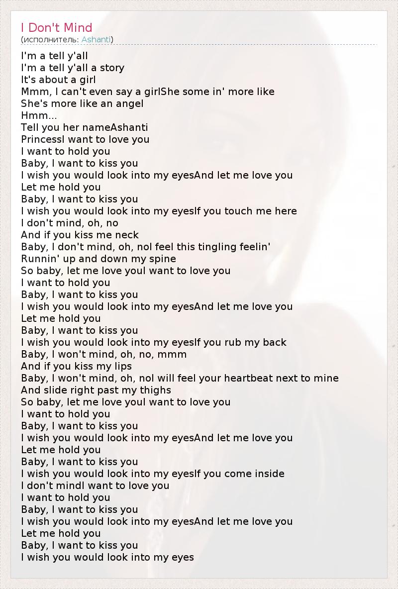 I'm a tell y'all I'm a tell y'all a story It's about a girl Mmm, I can't even say a girlShe some in' more like She's more like an angel Hmm... Tell you her nameAshanti PrincessI want to love you I want to hold you Baby, I want to kiss you I wish you would look into my eyesAnd let me love you Let me hold you Baby, I want to kiss you I wish you would look into my eyesIf you touch me here I don't mind, oh, no And if you kiss me neck Baby, I don't mind, oh, noI feel this tingling feelin' Runnin' up and down my spine So baby, let me love youI want to love you I want to hold you Baby, I want to kiss you I wish you would look into my eyesAnd let me love you Let me hold you Baby, I want to kiss you I wish you would look into my eyesIf you rub my back Baby, I won't mind, oh, no, mmm And if you kiss my lips Baby, I won't mind, oh, noI will feel your heartbeat next to mine And slide right past my thighs So baby, let me love youI want to love you I want to hold you Baby, I want to kiss you I wish you would look into my eyesAnd let me love you Let me hold you Baby, I want to kiss you I wish you would look into my eyesIf you come inside I don't mindI want to love you I want to hold you Baby, I want to kiss you I wish you would look into my eyesAnd let me love you Let me hold you Baby, I want to kiss you I wish you would look into my eyes