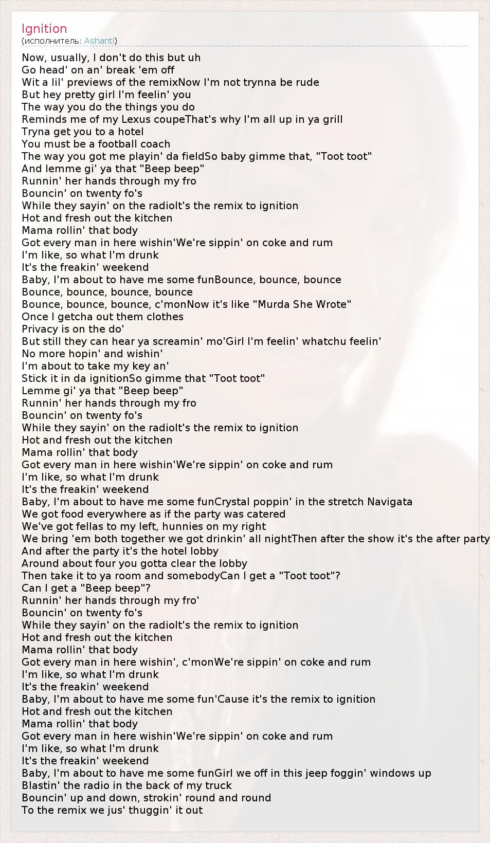 Now, usually, I don't do this but uh Go head' on an' break 'em off Wit a lil' previews of the remixNow I'm not trynna be rude But hey pretty girl I'm feelin' you The way you do the things you do Reminds me of my Lexus coupeThat's why I'm all up in ya grill Tryna get you to a hotel You must be a football coach The way you got me playin' da fieldSo baby gimme that, "Toot toot" And lemme gi' ya that "Beep beep" Runnin' her hands through my fro Bouncin' on twenty fo's While they sayin' on the radioIt's the remix to ignition Hot and fresh out the kitchen Mama rollin' that body Got every man in here wishin'We're sippin' on coke and rum I'm like, so what I'm drunk It's the freakin' weekend Baby, I'm about to have me some funBounce, bounce, bounce Bounce, bounce, bounce, bounce Bounce, bounce, bounce, c'monNow it's like "Murda She Wrote" Once I getcha out them clothes Privacy is on the do' But still they can hear ya screamin' mo'Girl I'm feelin' whatchu feelin' No more hopin' and wishin' I'm about to take my key an' Stick it in da ignitionSo gimme that "Toot toot" Lemme gi' ya that "Beep beep" Runnin' her hands through my fro Bouncin' on twenty fo's While they sayin' on the radioIt's the remix to ignition Hot and fresh out the kitchen Mama rollin' that body Got every man in here wishin'We're sippin' on coke and rum I'm like, so what I'm drunk It's the freakin' weekend Baby, I'm about to have me some funCrystal poppin' in the stretch Navigata We got food everywhere as if the party was catered We've got fellas to my left, hunnies on my right We bring 'em both together we got drinkin' all nightThen after the show it's the after party And after the party it's the hotel lobby Around about four you gotta clear the lobby Then take it to ya room and somebodyCan I get a "Toot toot"? Can I get a "Beep beep"? Runnin' her hands through my fro' Bouncin' on twenty fo's While they sayin' on the radioIt's the remix to ignition Hot and fresh out the kitchen Mama rollin' that body Got every man in here wishin', c'monWe're sippin' on coke and rum I'm like, so what I'm drunk It's the freakin' weekend Baby, I'm about to have me some fun'Cause it's the remix to ignition Hot and fresh out the kitchen Mama rollin' that body Got every man in here wishin'We're sippin' on coke and rum I'm like, so what I'm drunk It's the freakin' weekend Baby, I'm about to have me some funGirl we off in this jeep foggin' windows up Blastin' the radio in the back of my truck Bouncin' up and down, strokin' round and round To the remix we jus' thuggin' it out