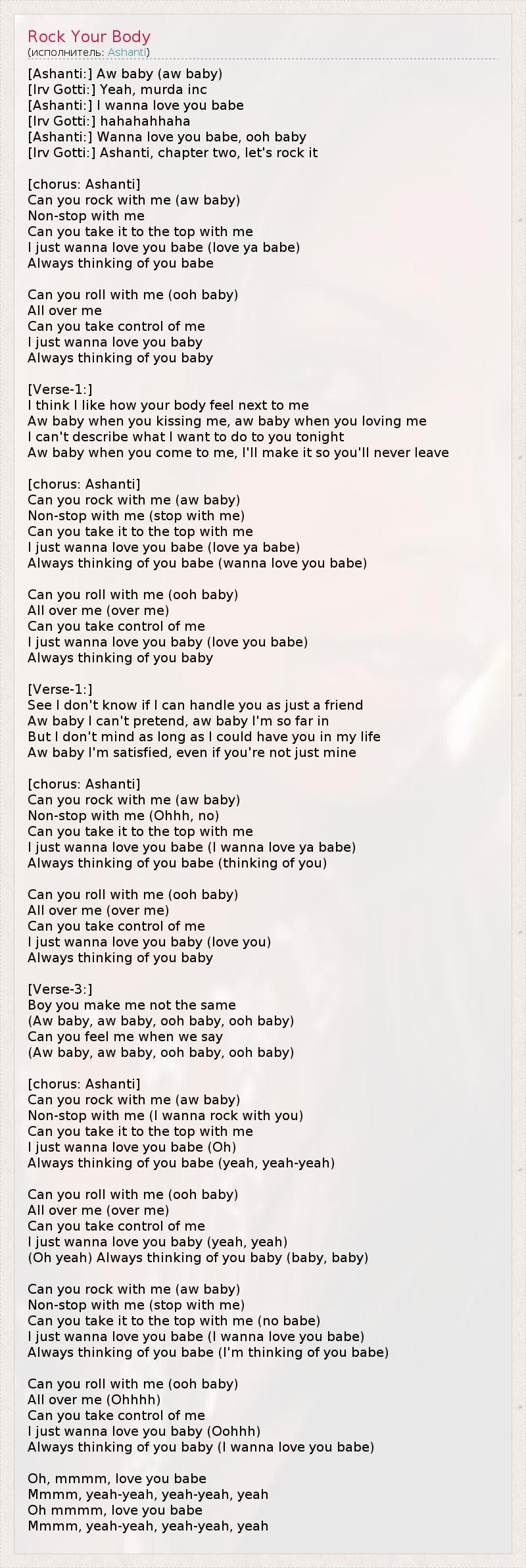 [Ashanti:] Aw baby (aw baby) [Irv Gotti:] Yeah, murda inc [Ashanti:] I wanna love you babe [Irv Gotti:] hahahahhaha [Ashanti:] Wanna love you babe, ooh baby [Irv Gotti:] Ashanti, chapter two, let's rock it [chorus: Ashanti] Can you rock with me (aw baby) Non-stop with me Can you take it to the top with me I just wanna love you babe (love ya babe) Always thinking of you babe Can you roll with me (ooh baby) All over me Can you take control of me I just wanna love you baby Always thinking of you baby [Verse-1:] I think I like how your body feel next to me Aw baby when you kissing me, aw baby when you loving me I can't describe what I want to do to you tonight Aw baby when you come to me, I'll make it so you'll never leave [chorus: Ashanti] Can you rock with me (aw baby) Non-stop with me (stop with me) Can you take it to the top with me I just wanna love you babe (love ya babe) Always thinking of you babe (wanna love you babe) Can you roll with me (ooh baby) All over me (over me) Can you take control of me I just wanna love you baby (love you babe) Always thinking of you baby [Verse-1:] See I don't know if I can handle you as just a friend Aw baby I can't pretend, aw baby I'm so far in But I don't mind as long as I could have you in my life Aw baby I'm satisfied, even if you're not just mine [chorus: Ashanti] Can you rock with me (aw baby) Non-stop with me (Ohhh, no) Can you take it to the top with me I just wanna love you babe (I wanna love ya babe) Always thinking of you babe (thinking of you) Can you roll with me (ooh baby) All over me (over me) Can you take control of me I just wanna love you baby (love you) Always thinking of you baby [Verse-3:] Boy you make me not the same (Aw baby, aw baby, ooh baby, ooh baby) Can you feel me when we say (Aw baby, aw baby, ooh baby, ooh baby) [chorus: Ashanti] Can you rock with me (aw baby) Non-stop with me (I wanna rock with you) Can you take it to the top with me I just wanna love you babe (Oh) Always thinking of you babe (yeah, yeah-yeah) Can you roll with me (ooh baby) All over me (over me) Can you take control of me I just wanna love you baby (yeah, yeah) (Oh yeah) Always thinking of you baby (baby, baby) Can you rock with me (aw baby) Non-stop with me (stop with me) Can you take it to the top with me (no babe) I just wanna love you babe (I wanna love you babe) Always thinking of you babe (I'm thinking of you babe) Can you roll with me (ooh baby) All over me (Ohhhh) Can you take control of me I just wanna love you baby (Oohhh) Always thinking of you baby (I wanna love you babe) Oh, mmmm, love you babe Mmmm, yeah-yeah, yeah-yeah, yeah Oh mmmm, love you babe Mmmm, yeah-yeah, yeah-yeah, yeah